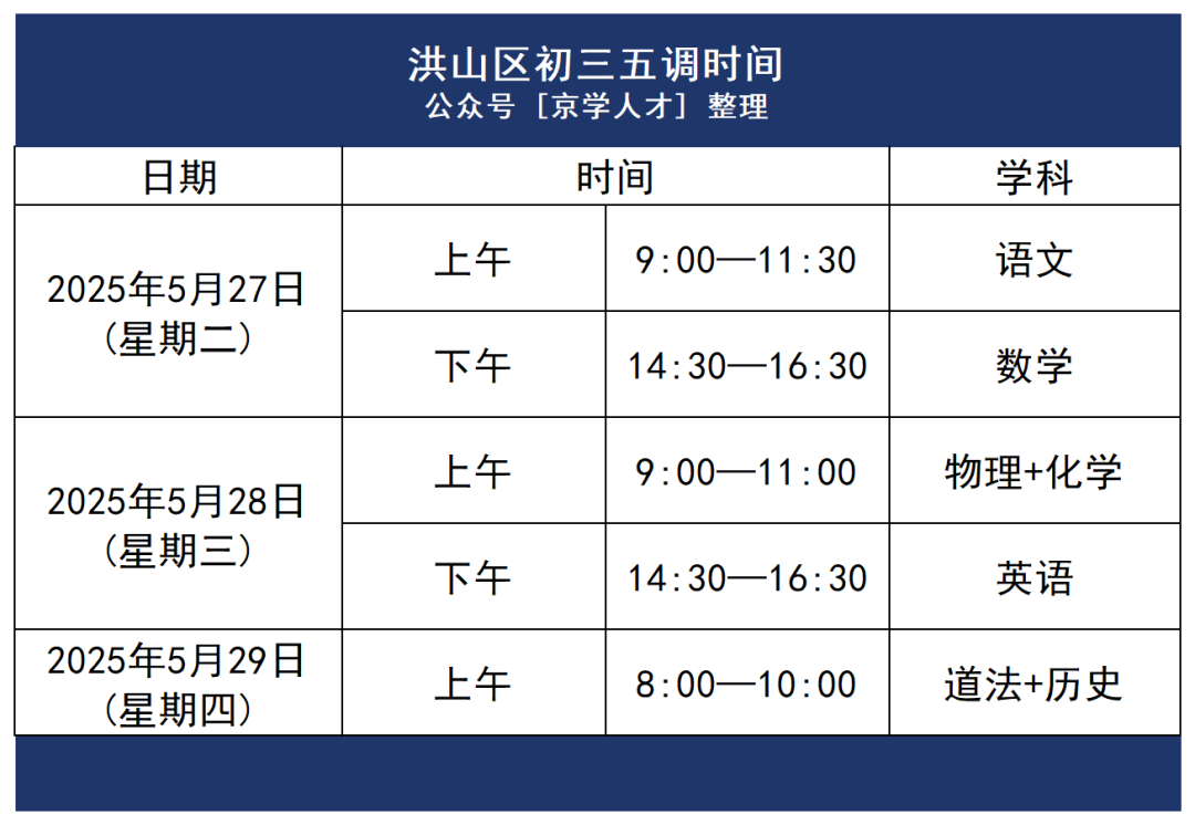 2025年东湖高新区初三五调时间为5月20日(周二)至5月22日(周四),考试科目和试卷结构与中考相同。